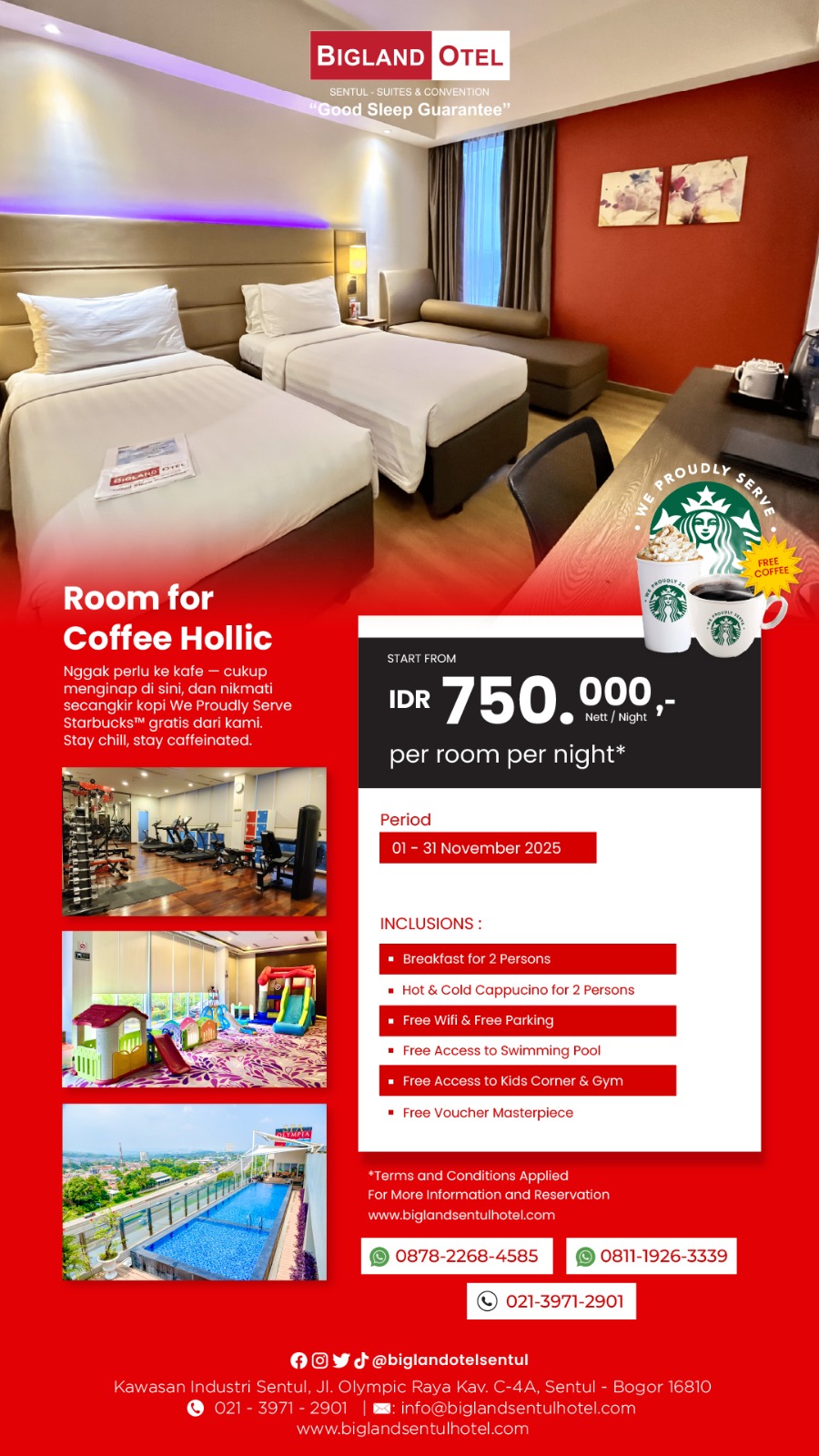 Bigland Sentul Hotel & Convention or the previous brand was Hotel Olympic Renotel Sentul is fits for those of you who are simply on a business or leisure trip. This hotel is conveniently situated next to Sentul Toll exit from Jagorawi Toll Road at the southern boundary of the Sentul Industrial Estate and within a 5-10 min drive to Sentul International Convention Center. Bigland Sentul Hotel & Convention is the First Hotel that provides Rooftop Swimming Pool in Bogor, along with diverse facilities such as a Grand Ballroom, 12 meeting rooms, an all-day dining Restaurant, Cozy Cafe, Business Corner, Kids Corner, Fitness Center, and an Executive Lounge. The Hotel also very convenient for Business and Leisure destination especially the Family market on the weekend as its located very closed to Bogor (mountain) which provides a good climate & fresh air. Be sure to check out popular waterfalls like Leuwi Hejo Waterfall and Bidadari Waterfall, which are all a short distance from the hotel. We’re sure you’ll enjoy your stay at Bigland Sentul Hotel & Convention as you experience all of the things Sentul has to offer.